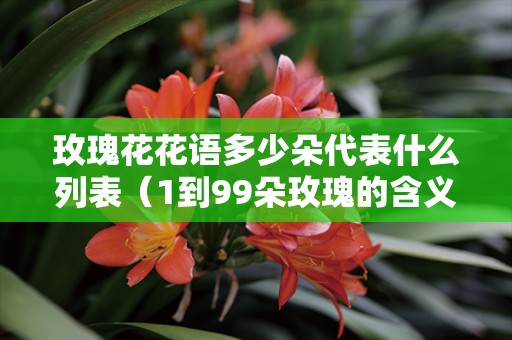 1朵:你是我的唯一;2朵:世界上只有你和我;3朵:I LOVE YOU;4朵:誓言、承诺、爱的宣誓;5朵:无怨无悔;6朵:顺心如意、顺利、永结同心、愿你一切顺利;7朵:你让我深深的迷恋、我偷偷地爱着你;8朵:弥补、歉意、深深歉意、请原谅我;9朵:长相厮守、坚定;10朵:十全十美;11朵:我爱你一生一世;12朵:全部的爱;比翼双飞、圆满、心心相印、每日思念对方;13朵:暗恋;14朵:骄傲;15朵:守住你的人;16朵:一帆风顺;17朵:伴你一生;18朵:青春美丽;19朵:爱得最高点;20朵:两情相爱。